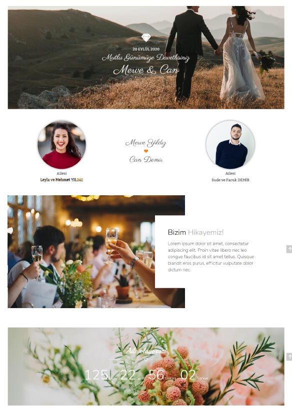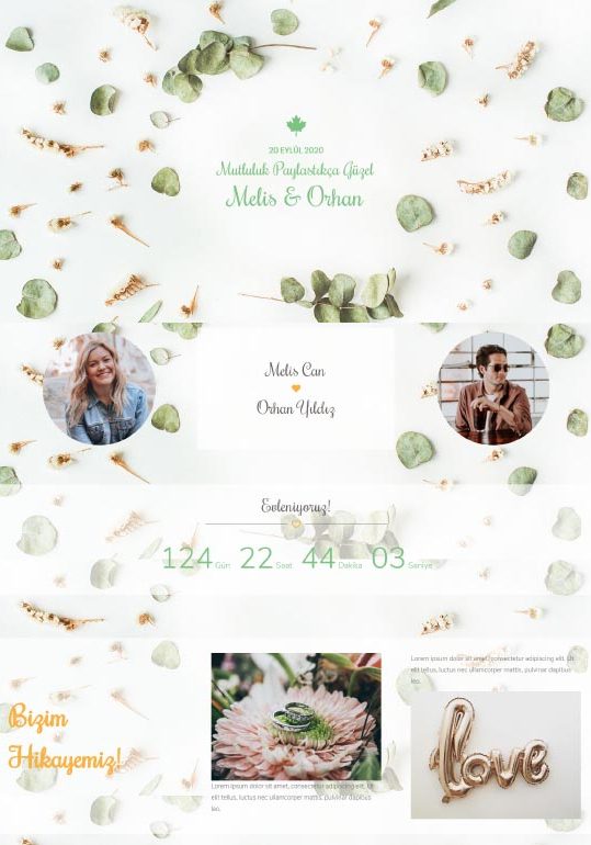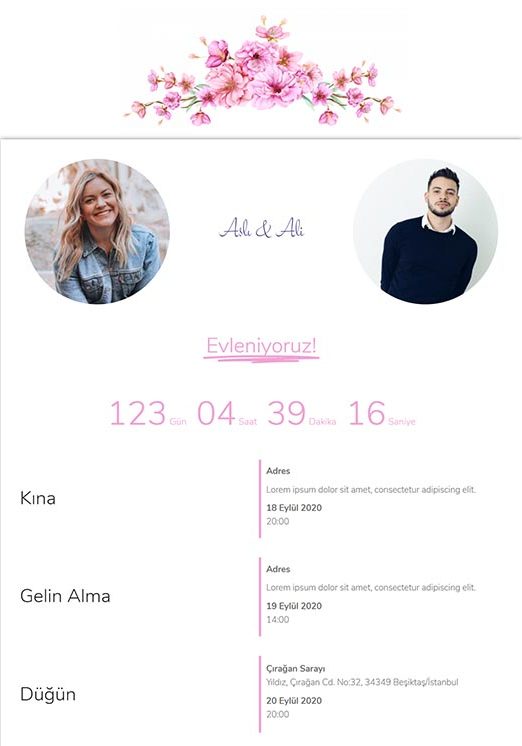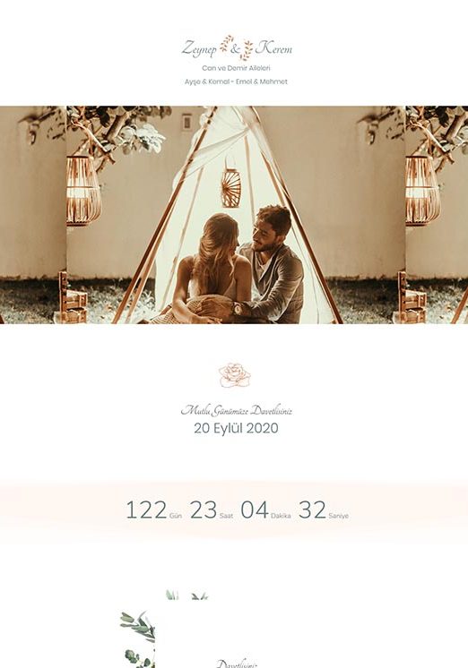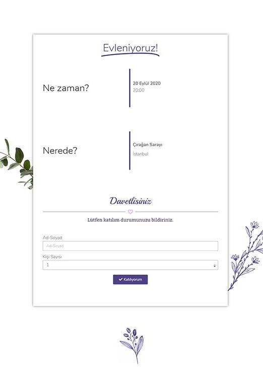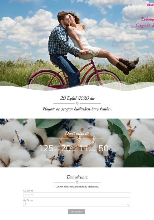 Siz çiftimize özel oluşturduğumuz sayfanızda anılarınızı, düğün yeri bilginizi, geri sayım ile kalan sürenizi paylaşın. Davetlilerinizden katılım bilgisi alın.