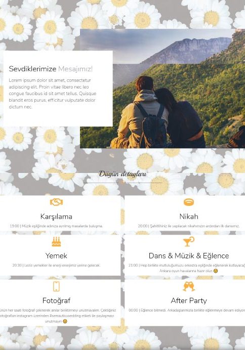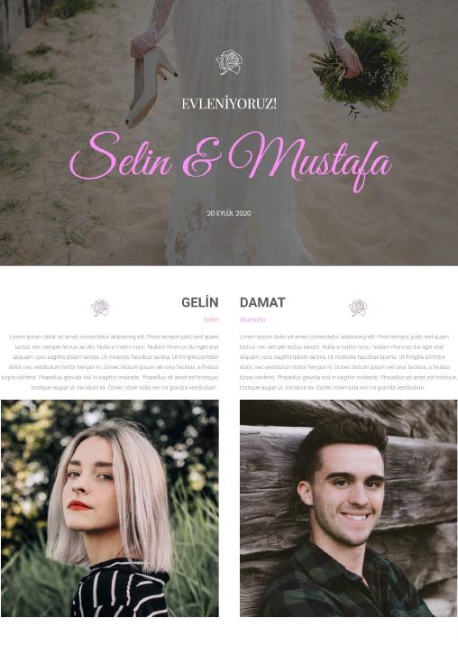 Nikah, Kına, Gelin alma bilgileri, sevdiklerinize mesajlarınız, gelin ve damat yorumları gibi tüm detayları sizin için davetiyenize ekleyebiliriz.